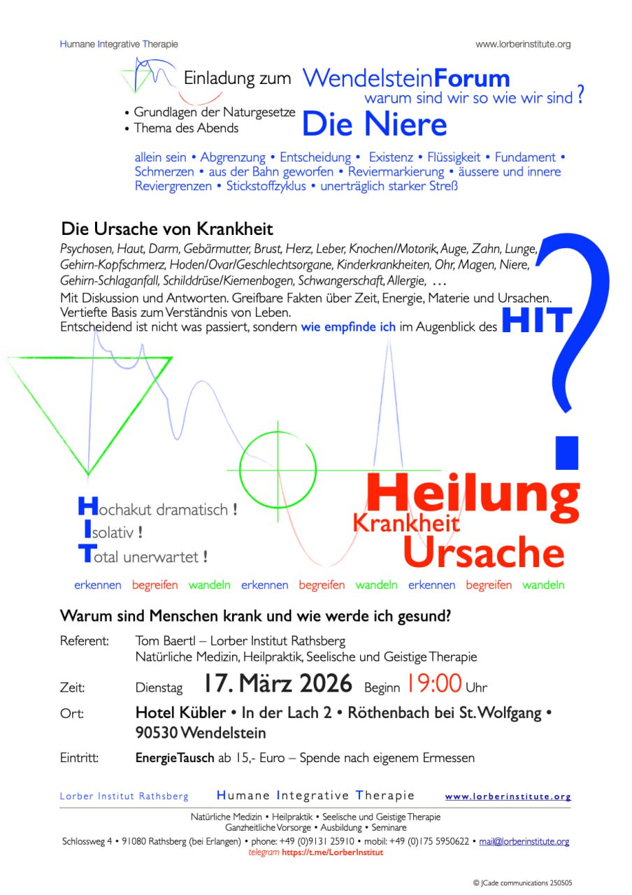 Wendelsteinforum mit Tom Baertl – Thema: Die Niere Datum 17 März 2026 Abgelaufen! Uhrzeit 19:00 Labels Deutschland Standort D-90530 Wendelstein - Hotel Kübler In der Lach 2, D-90530 Wendelstein, Röthenbach bei St. Wolfgang, Kategorie 5BN Austausch Vortrag Redner Tom Baertl Tom Baertl 2 Jahre Medien 7 Jahre Pharma 40 Jahre Medizin davon mehr als 35 Jahre in dem BewusstSein der Naturgesetze Nächste Veranstaltung Zweiteiliges 5BN-Seminar mit Daniel Stoica jeweils drei Tage Datum 20 - 22 März 2026 Uhrzeit 9:00 - 17:00 Teile diese Veranstaltung